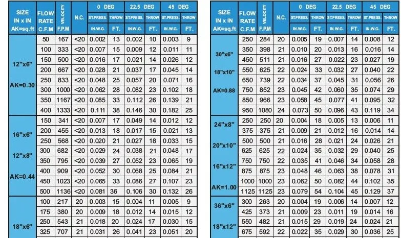با داشتن دبی هوا عبوری از دریچه و سرعت ایده آل مورد نظر، ابعاد دریچه را با استفاده از جداول مربوط بدست می آوریم. سرعت ایده آل دریچه برای دستگاه DX، عدد 500fpm و برای دستگاه Airwasher، 600fpm می باشد.می توانید از جدول زیر کمک بگیرید.