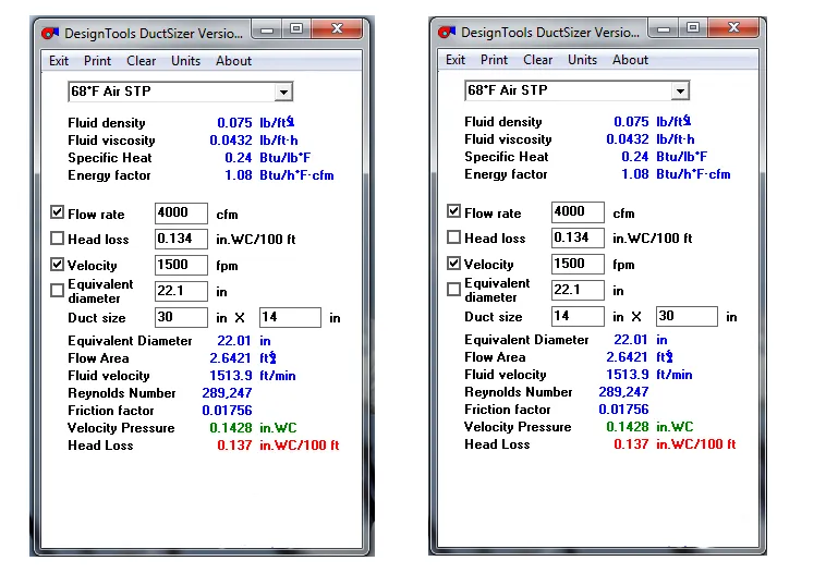 فشار هوا در کانال بر حسب اینچ آب گیج محاسبه میشود. بعد از محاسبه ظرفیت دستگاهها، برای محاسبه ابعاد کانال هوا آنها باید از نرمافزار Duct Sizer استفاده کنید. حال بر فرض اینکه سرعت اولیه 1600–1400 fpm باشد. با داشتن حجم هوادهی، ابعاد کانال متصل به دستگاه به دست خواهد آمد. برای اینکه بتوانیم ابعاد سایر کانالها را بدست آوریم، باید مقدار افت فشار بدست آمده در قسمت قبل را استفاده نماییم.